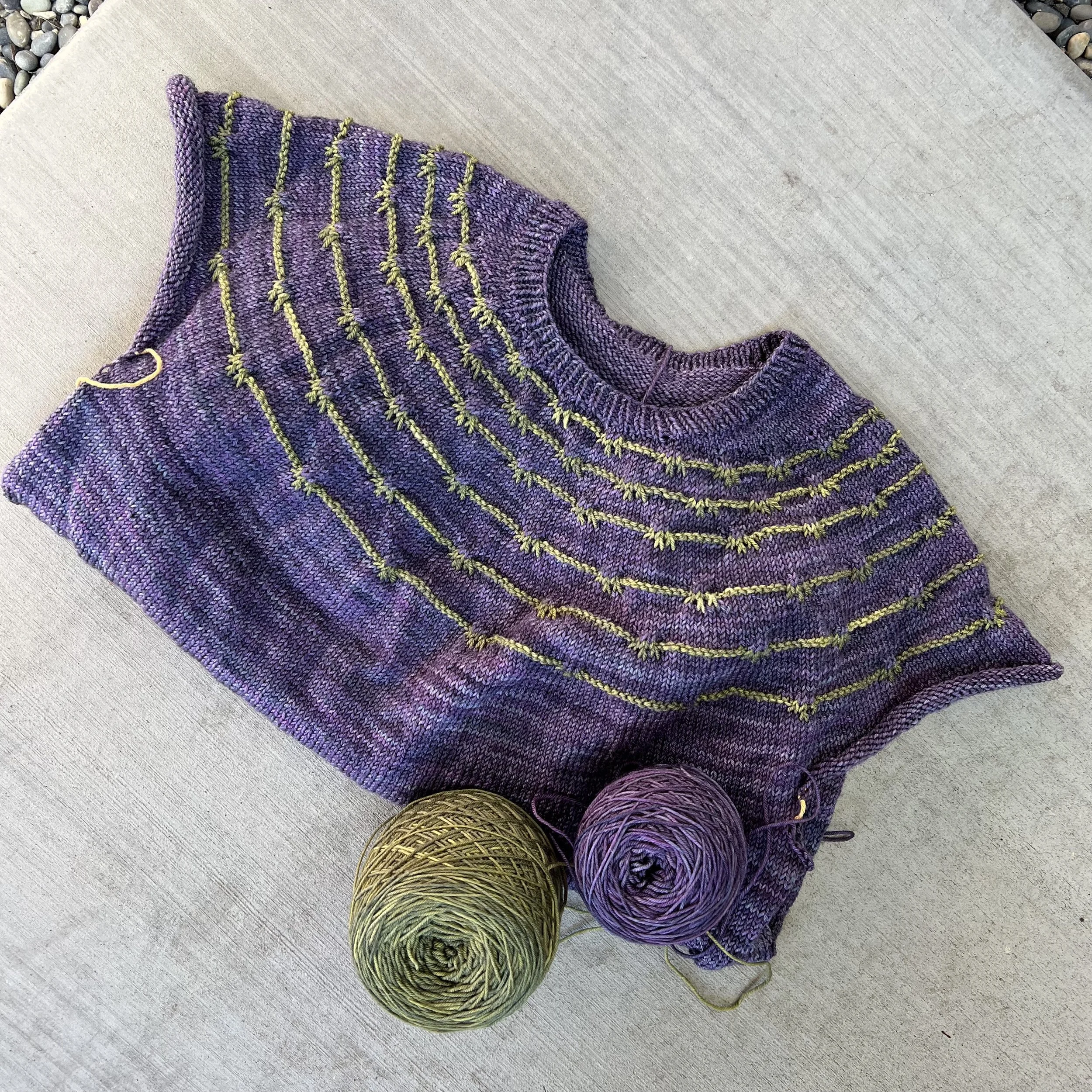 Hay Girl Striped Socks — Carolyn knit a pair of toe up socks using self-striping yarn from Knit, Spin, Farm. The color way is “Hay Girl”, which makes us smile. The socks are knit from the toe up and feature asymmetrical toes and a gusset heel.